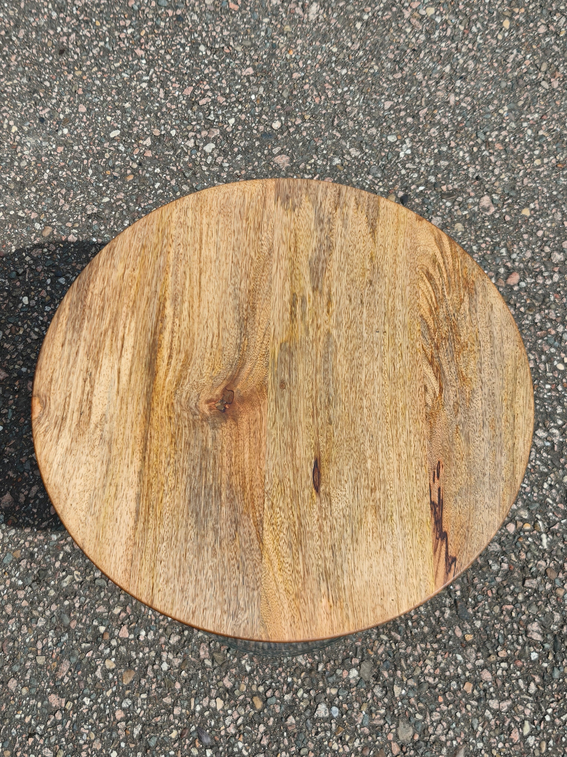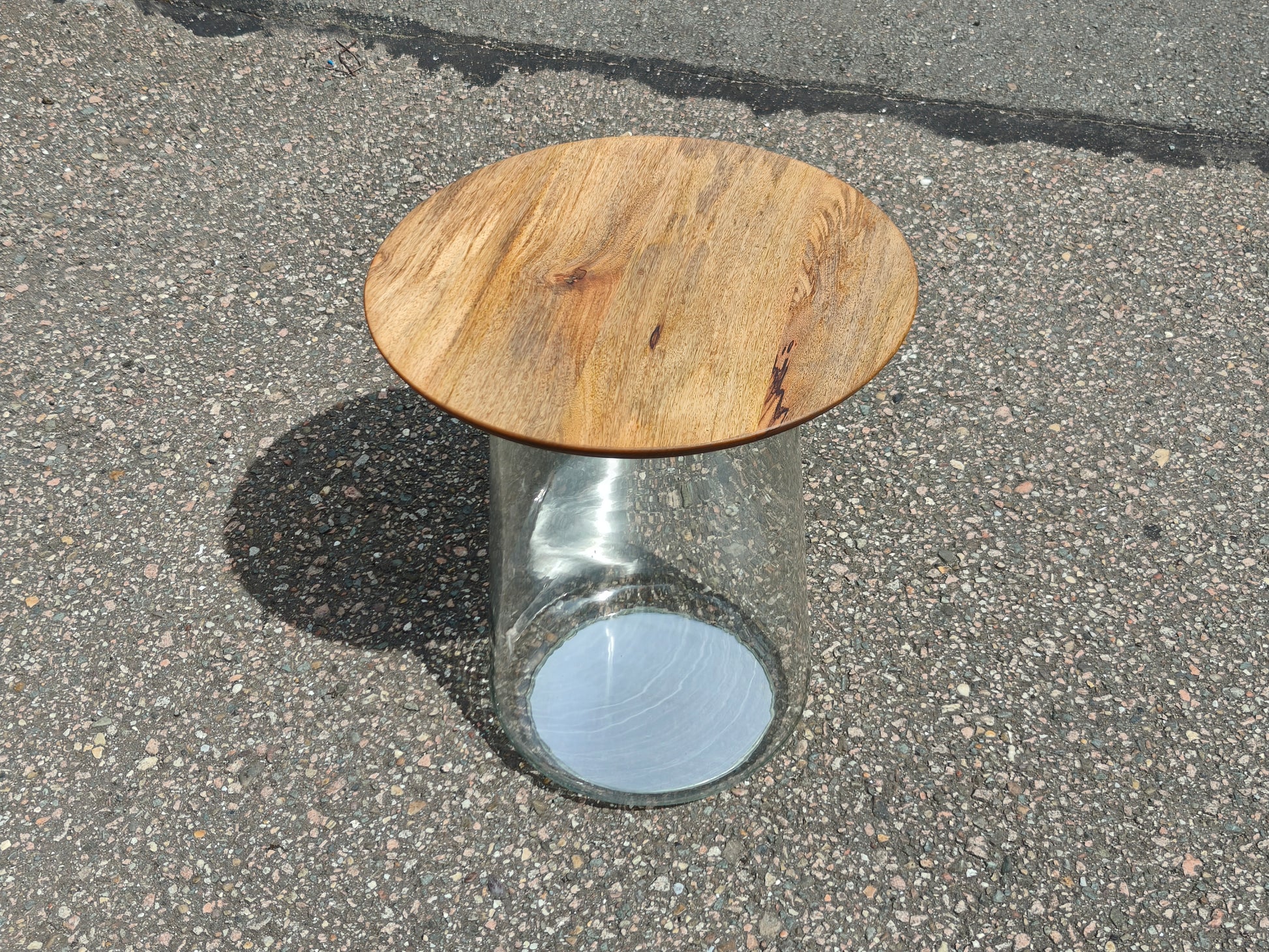 This uniquely styled side table features a solid mango wood top and a cylindrical clear glass base. The wooden surface has been fully restored and finished with Osmo TopOil, enhancing the vibrant grain and ensuring long-lasting protection.