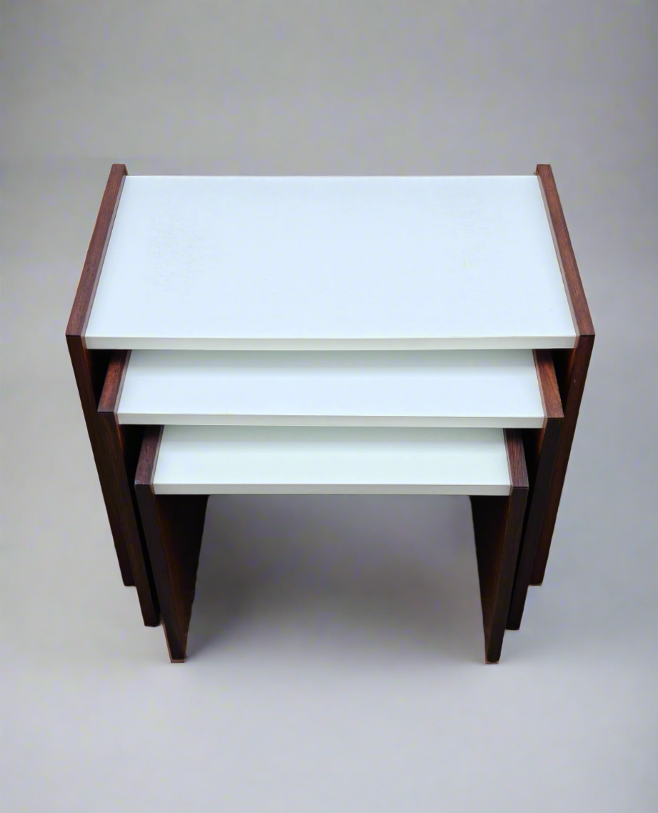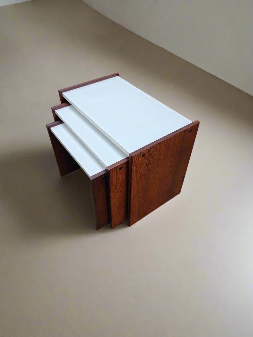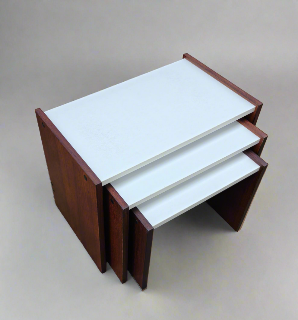 Zeldzame vintage set van drie nesttafels uit de iconische Japanse Serie van Pastoe, ontworpen door Cees Braakman in de jaren 50. Strak minimalistisch ontwerp met contrasterende witte bladen en donkere teak gefineerde zijpanelen. Deze set is professioneel gerestaureerd en verkeert in prachtige staat.