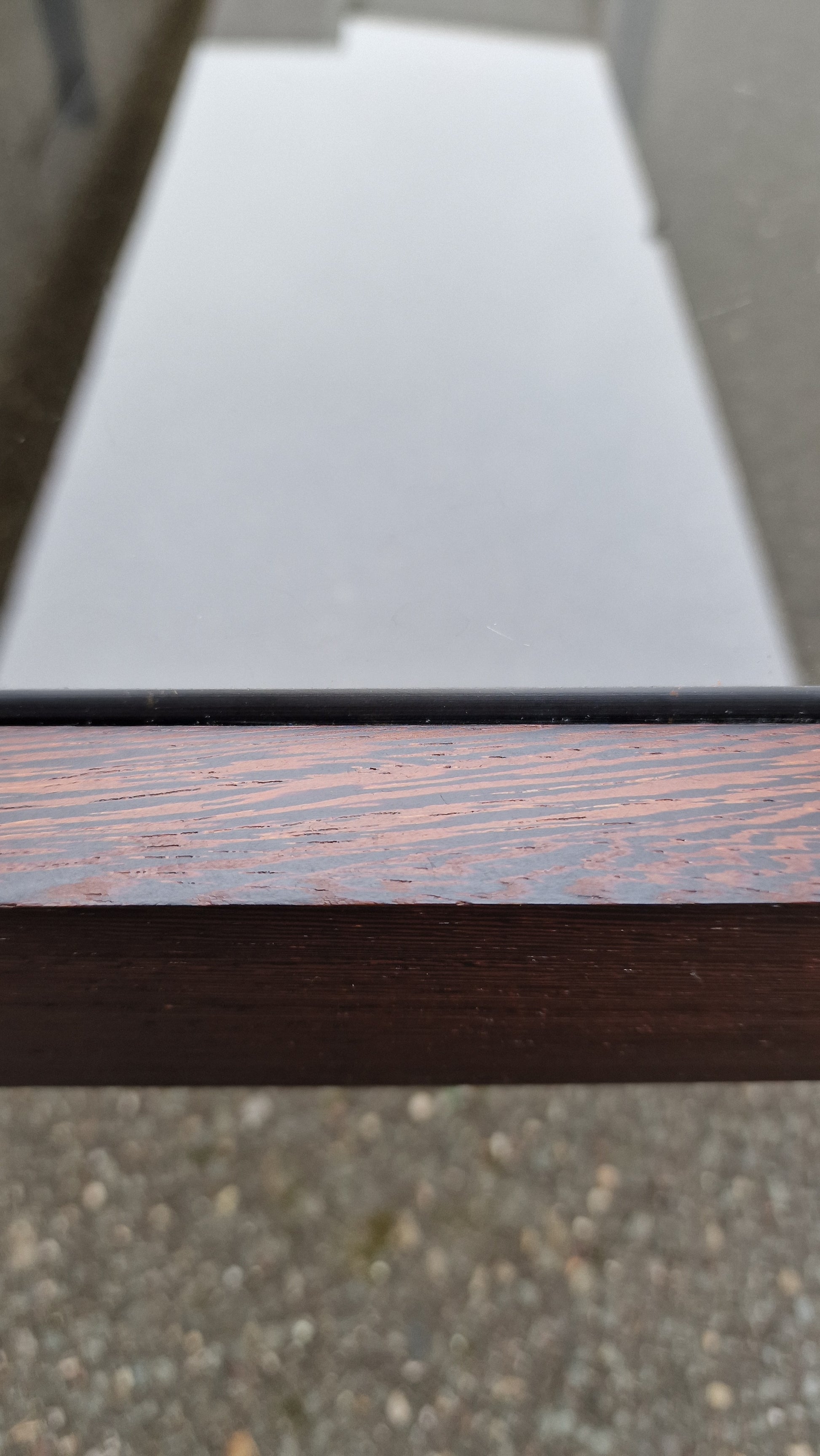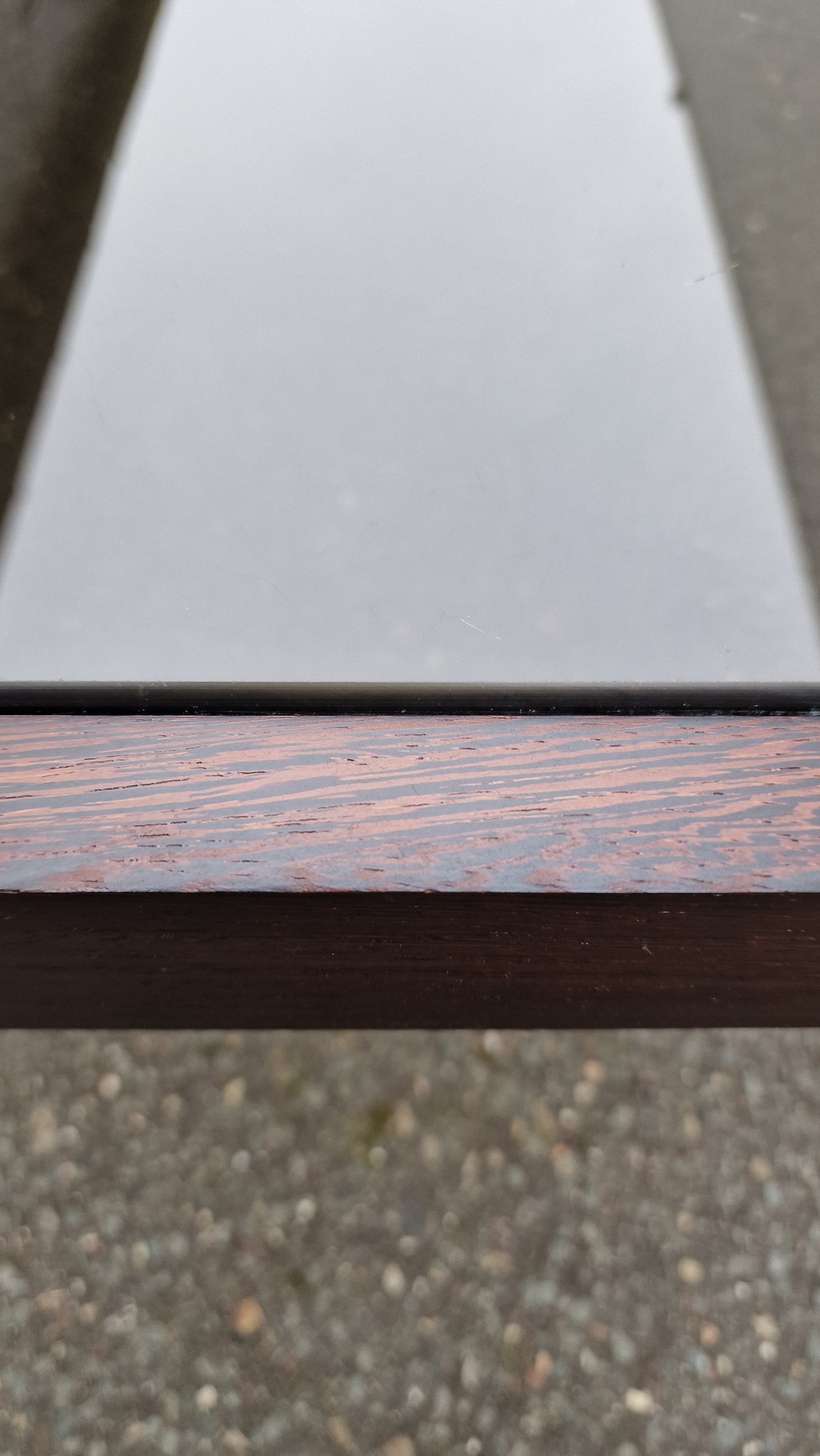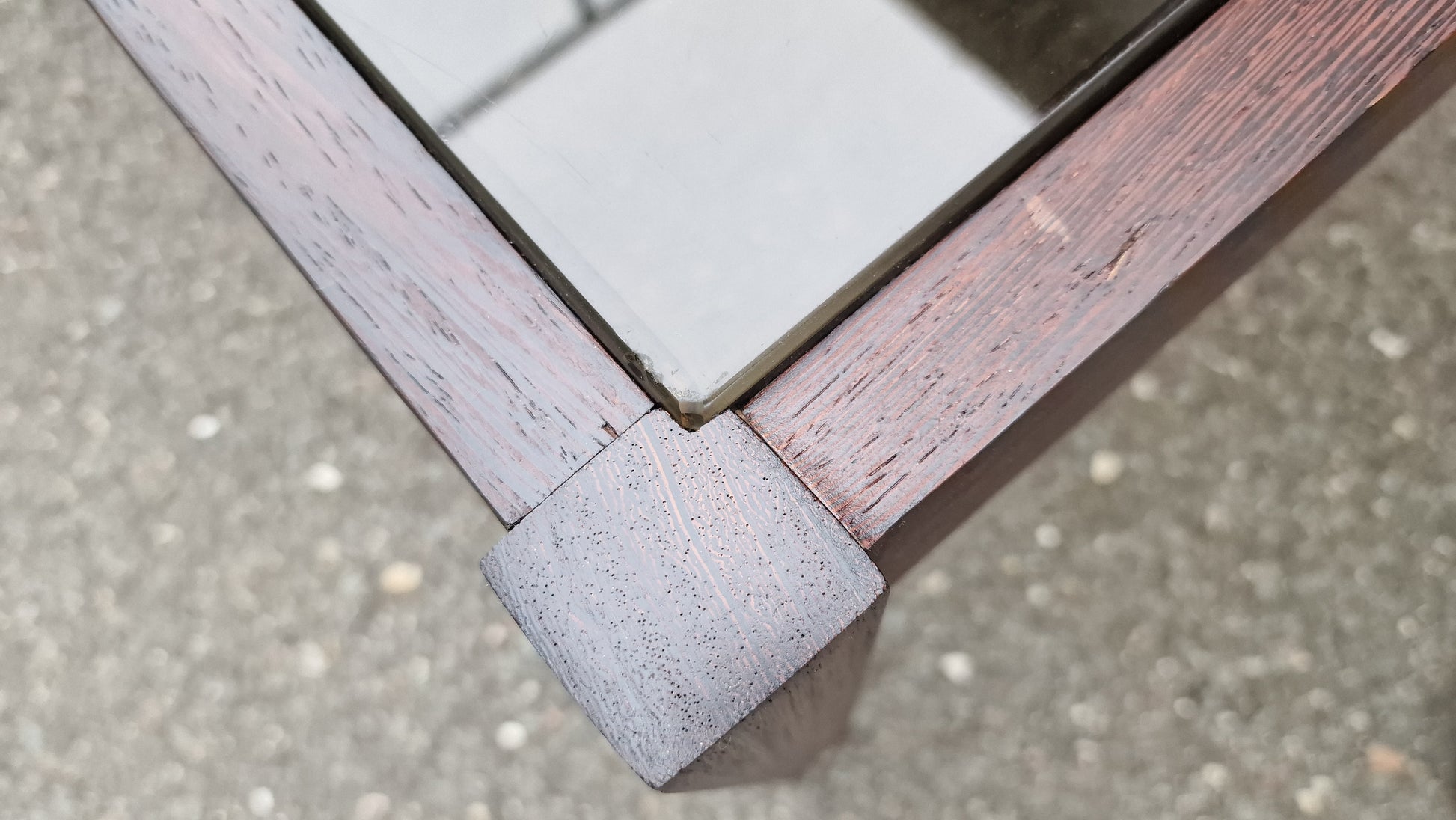 Condition: Fully restored wooden frame, treated with Osmo finish. Original smoked glass top shows traces of use.